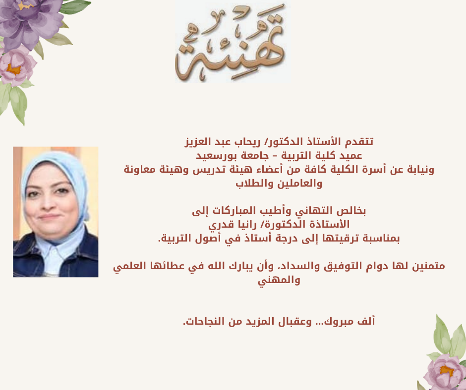تحت رعاية الأستاذة الدكتورة ريحاب أحمد عبد العزيز نصر – عميد كلية التربية، أُقيمت يوم السبت الموافق 27 سبتمبر2025 مناقشة رسالة الماجستير المقدمة من الباحثة آية علي محمد أحمد عبدالله بعنوان: «استخدام التلعيب الإلكتروني في تعديل التصورات الكيميائية البديلة وتنمية الخيال العلمي لدى طلاب المرحلة الثانوية». لجنة الإشراف: أ.د/ ريحاب أحمد عبد العزيز نصر –