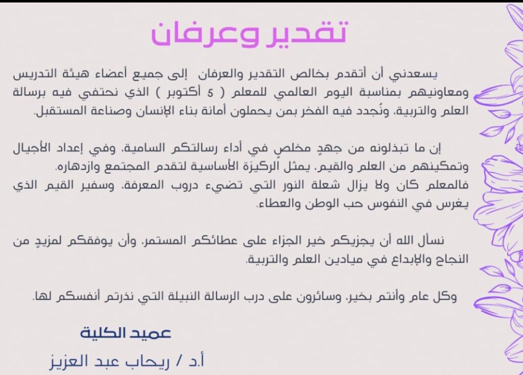 كلمة سعاد الاستاذ الدكتور ريحاب أحمد عبد العزيز مع الطلاب الجدد بالكلية التربية وقد القت كلمة بمناسبة بدء العام الجامعي 2025 /2026 السادة الوكلاء ، السادة أعضاء هيئة التدريس والهيئة المعاونة، الجهاز الاداري،أبنائي وبناتي طلاب كلية التربية يسعدني أن أرحب بكم جميعًا في رحاب كلية التربية مع بداية عام جامعي جديد نخطو فيه نحو مزيد