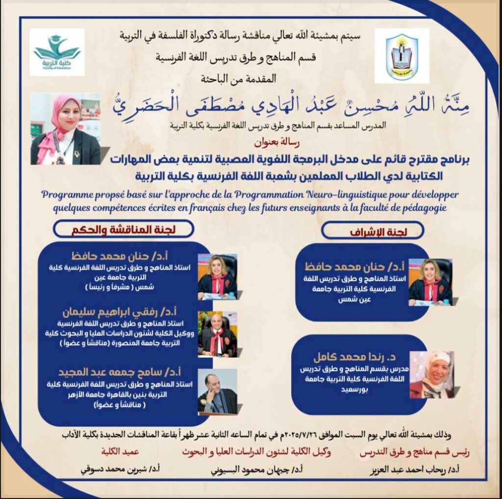 دعوة لحضور مناقشة الدكتوراه بقسم المناهج وطرق التدريس