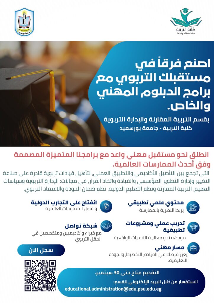 يعلن قسم التربية المقارنة والإدارة التربوية بكلية التربية عن انطلاق التسجيل في برامجه النوعية المتمثلة في الدبلوم المهني والدبلوم الخاص، والتي صُممت خصيصًا لإعداد قادة تربويين وصنّاع قرار يمتلكون المهارات الحديثة في الإدارة والتخطيط التربوي.